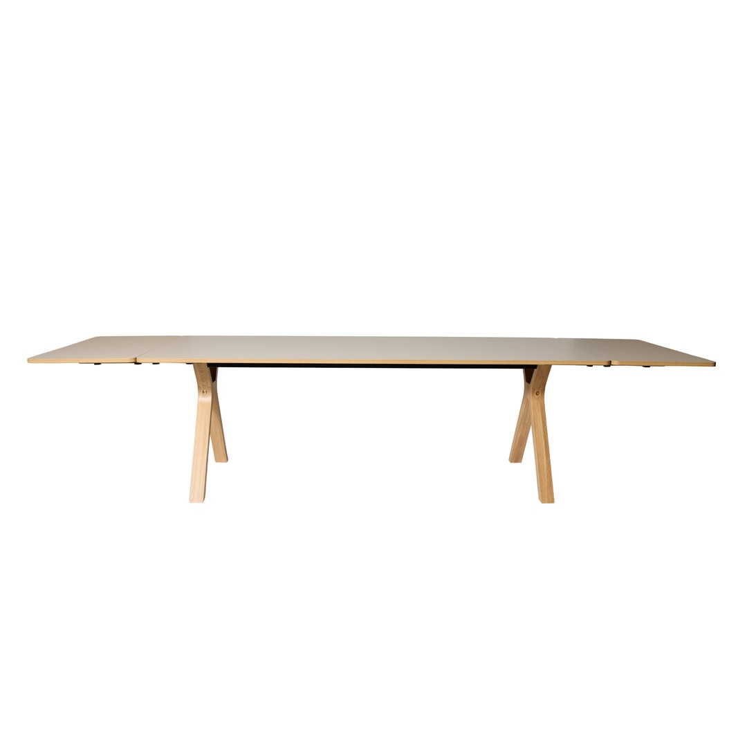 The dining table is designed to accommodate two extension leaves, which can be mounted at each end to provide space for up to four additional chairs. The extension leaves feature rounded corners, adding an elegant design detail. They are mounted using a wooden rail beneath the tabletop and secured with thumb screws, ensuring a stable and safe solution. Please note that the extension leaves are not intended to carry the same weight as the fixed tabletop.